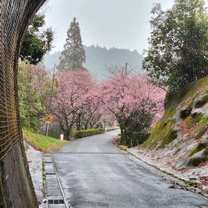 愛知県新城市長篠地区の旧田口線(鉄道跡)沿いの河津桜。🌸🌸🌸 旧トンネル内から。 田んぼに写る河津桜 鉄道ファンには有名なポイントです。今が見頃。✌️🤗🐶