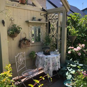 今日は 暑い 溶けてしまいそう😰💦 30度以上あるわきっと😵 シーチングアーバーの中のテーブルに 昨日買ってきた 布かけて ちょっと小洒落てみた😅 この場所以外に 日陰 今日も一日 外に居てしまった😵💦🌹