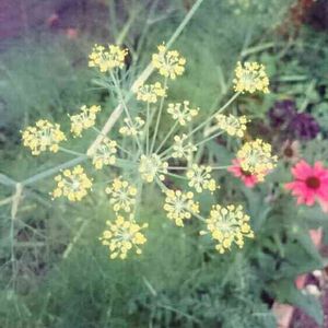 フェンネルさんの手前に こぼれ種で育ったピンクのお花🌸 お名前はなんでしょう❓ ご存知のかた教えてくださいね❣️