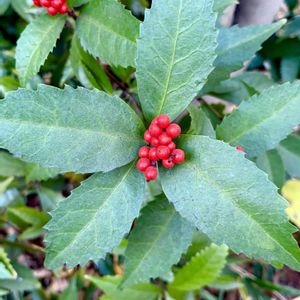 🔴センリョウ(千両) クリスマスからお正月に飾られることの多いです。花言葉は「利益・財産・裕福」という縁起のいい植物です。 ⚫︎センリョウ科 センリョウ属 ⚫︎原産 日本 ⚫︎花期 6月〜7月 ⚫︎果期 11月〜1月
