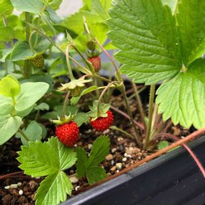 ぎぼうしとワイルドストロベリー ぎぼうしの横でワイルドストロベリーの赤い実が隠れていました。 ワイルドストロベリーは鉢植えなので向きを変えて写真を撮りました。