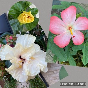 色々咲いてます🌸 右上アノダクリスタータ 右下ナデシコ 左下アジアンハイビスカス(アベルモスクス、アカバナワタ)🌺 左上クレマチス ヘンダーソニー ナデシコ以外は地植えです🌿