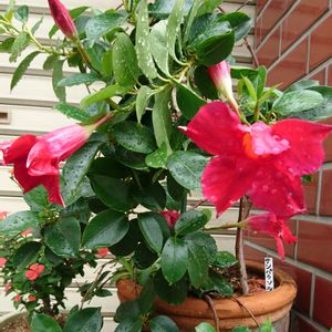 マンデビラサンパラソル 通り道のお宅の生垣に 朝のウォーキングで🚶♀️ 朝の散歩道 昨日の1枚 複数枚投稿 新機能