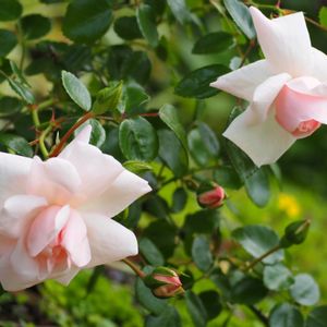 こんにちは♪ せっかくの週末は雨🌧️ これから本格的に降るみたい😞 寂しくなってきた我が家のバラですが…ここからは優しいピンクのニュードーンが主役かなぁ😊 庭の南東エリアで本来は1番の陽当たり良い場所ですが、角にはコニファー、東側は塀と薄暗くなってます💦 樹勢・耐陰性の強いバラをとこちらを選びました。昨秋コニファーの背丈を1/3に切った🪚のもありますが、予想以上の暴れ方😅💦 ③プリンセスダイアナともコラボし始めてます🎶 ④収まらない枝をオベリスクに誘引したけど収めきれずあっちこっちに伸びてます😂 ⑤庭が狭くこの場所は特に狭くて💦 頼りないですが細い支柱をアーチ状に組んで、通路の頭上でアンジェラと出逢えるつもり😅 秋には叶うと良いなぁ🎶 生憎の雨ですが良い時間を過ごしたいですね😉