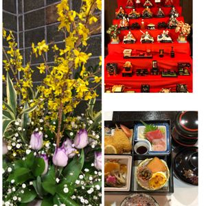 いつもの料亭のお雛様 お花 お弁当🍱 料亭の🎎お雛様は 8段飾り😱 お道具 ゆったり飾ってありました お花は レンギョウ チューリップ🌷 かすみ草 柔らかな色合いで 綺麗 夕食のお弁当🍱 鮭の薄い味噌漬け お刺身 美味しかったです この料亭の🎎お雛様 若女将のかなぁ 菊水作の 優しいお顔のお雛様でした