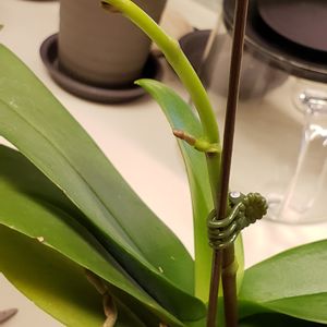 胡蝶蘭 シーナズトリスさん😊 花芽が大分伸びてきたので支柱に添わせてみました😊