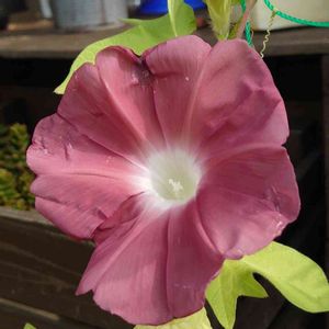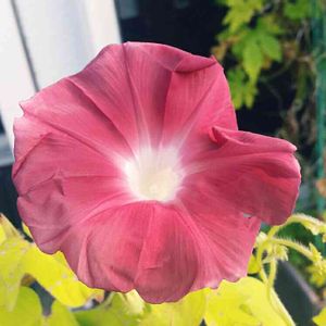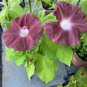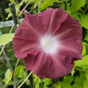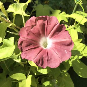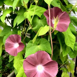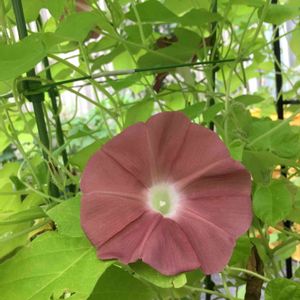 団十郎朝顔❁黄蝉葉栗皮茶丸咲大輪 花友ちゃんから入手が難しいと言われている 団十郎さんの種をいただきました🙌 なかなか咲いてくれなかったのですが やっ~と姿を見せてくれました(*^▽^*)🎶 だけど、3m近い高い所で咲いているし😓 周りの葉っぱが邪魔でよく見えません😵💦 脚立に上って正面からの撮影を試みましたが おチビの私ではそれでも届かず‥😂 結局、横顔だけしか撮れなかったのですが 渋みのある素敵な赤(茶!?)は 本当に美しい~💜💜👏 *****memo***** 団十郎朝顔は江戸時代の二代目市川團十郎が 歌舞伎十八番『暫』で用いた、 海老茶色の半被の色に ちなんで名付けられたそうです😃 諸説あるようですが🔍️ 現在、正式な団十郎と呼べるものは *美しい濃い茶色で無地の花 *真っ白な輪郭の筒抜け(花の中央)がある *明るい黄蝉葉(斑はない) *大輪の丸咲き 以上がすべて揃っているもの💡 上記以外の 白い覆輪のあるもの、 斑入りの葉、緑の葉、矢車咲きなど H.Cや園芸店で売られているものは 所謂ナンチャッテ団十郎で、 『新団十郎』などと呼ばれているそうです(^^;