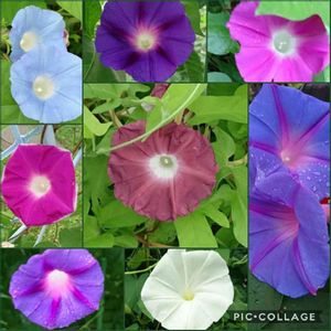 今日のお花、アサガオです。これは今までに育てたアサガオの過去写真からコラージュしてみました。今年は、落ち生えと、団十郎しか育ててません。来年はまた色々種をまこうと思っています。写真の、采咲き朝顔と、団十郎と、黄色い朝顔は苗からですが、他はすべて種から育てたものです。切れ弁のスプリットペタル・セカンドと、サンライズセレナーデは、変わった花型ですが、発芽率も花付も良くて育てやすい品種です。こぼれだねでも同じ花型のものが咲きます😁アーリーコールMixは、夜明るい環境でも咲いてくれるのがありがたい品種です。黄色い朝顔は、ある通販のカタログで見つけて珍しいので購入したものです。アフリカ原産の、原種だそうで、ものすごく小輪でルコウソウより一回り大きい程度です。黄色というよりクリーム色という感じで、あまり目立たない野性的なお花でした。アーリーヘブンリーブルーは、有名なヘブンリーブルーの早咲き品種で、普通のアサガオと同じように7月から咲きます。ミニスカイブルーは、とっても小輪の可愛い品種です。カーニバルオブベネツィアは、多分今たくさん生えてくる落ち生えのアサガオの親だと思います。これを育てたのはもう何年も前なのですが、そのあと毎年、親と同じ、白地に青かピンクの絞り、白にピンクぼかし、濃い青紫、白、の小輪のアサガオが出てきます。花色Mixなのに、各色はきっちりした固定種なんだなあと、ちょっと感心します(*^▽^*)