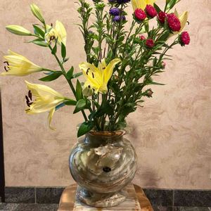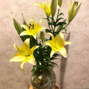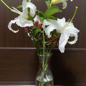 明日は雨の予報なので、カサブランカを切って、玄関に生けちゃいました😉 剣山で生けるには重くて、難しいです😅