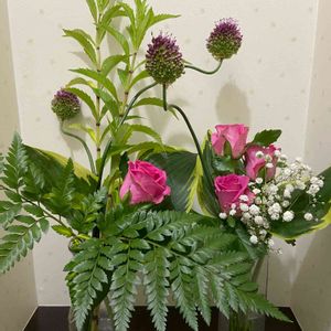 こんばんは♪ 先日投稿したものを あやまって消してしまった! 再投稿いたします🙇🏼♀️ タンチョウアリウムと薔薇です🌹
