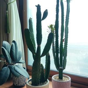 いつも一緒の異種棒コンビ、墨烏帽子とトリゴナ。 方や西インド諸島出身のサボテン、方やアフリカ出身のユーフォなんだけど、異種ながらともに強光を好み、水やり頻度も同じ、またどちらも気を付けないと衣服やカーテンに引っかけやすいので置き場注意⚠だからです 笑 墨烏帽子は先端に新しい芽が出てきてなんとも可愛い。もっと大きくなっていいよ👌 トリゴナは今にも倒れそうだけど、こうやって眺めるとこのひょろ長い姿がやっぱりカッコいいので、胴切りに踏ん切りが付かないのよね… 🏷️棒の日 参加させていただきます