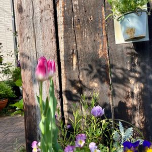 玄関の門扉がわりの枕木の前の今🌸 このチューリップ🌷の色合い可愛い💕 パンジーはもう終わりかけ