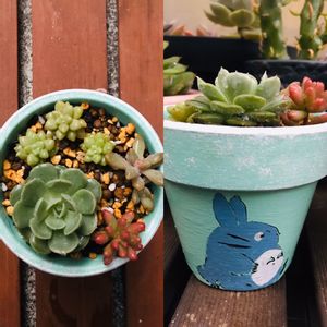 おはようございます❗️ GSで知り合った多肉ちゃんから頂いた素敵なリメ鉢多トトロ鉢に次女が頑張って寄植えしました🤗 トトロの映画で木が伸びるからと後ろ側に星の王子と金の成る木を入れたいと言いながら寒い中せっせと寄植え😂 とても楽しいと言っていて可愛かった❤️😍