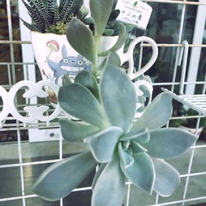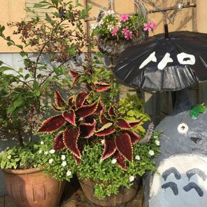 トトロのカップに詰め詰めした寄せ植え。こんなに大きくなるとは予想外!乗り出して迫ってきた‼️