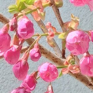 家の玄関脇 鉢植え河津桜 やっと満開になりました こんなにたくさん 咲いたのは 植え付けてから初めてのことです 頑張ったね 花は下向きに咲いてます