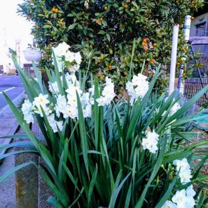 散策の通り道に有るお宅の花壇に、金柑と白い水仙が植えられていました。