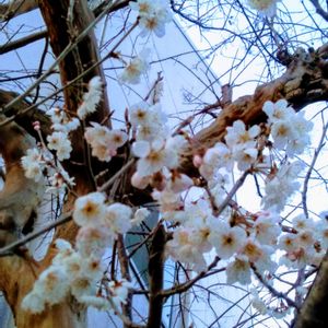 散策中に、建物の隙間に咲いている、幹は桜🌸だけど、花は桜🌸とも梅🏵️とも見える花が咲いていました。桜と梅の木が、接ぎ木されたのかな⁉️