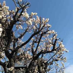 散策中の通り道に有るお宅の梅の枝が、生垣を乗り越えて、咲いていました。