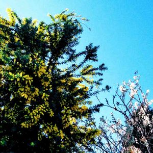 散策の途中のお宅の、塀の中にミモザと桜🌸が、咲いていました。