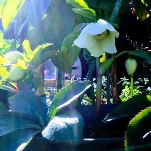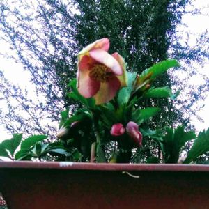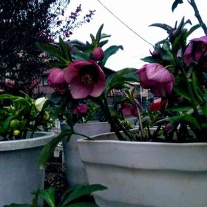 散策の通り道の花壇に、鉢植えのクリスマスローズが、置かれていました。