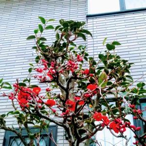 散策の通り道のお宅に、塀からボケの花が、顔を出していました。 随分、背の高いボケの木でした。