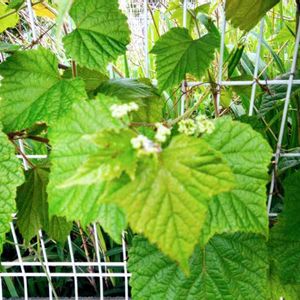 朝取れ野菜の「やじろべえ」の側のフェンスに、野ブドウに花芽が、出ていました。