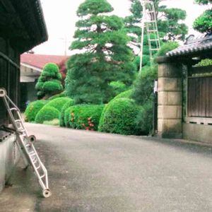 散策中の出会いです。 大きな保存樹木も有る、お屋敷の裏玄関です。 植木屋さんが、手入れをしていました。