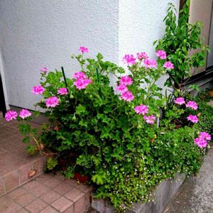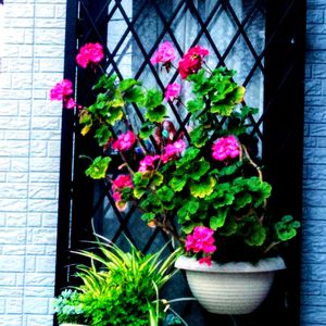 散策の通り道のお宅の窓に、ゼラニウムの鉢が、飾られていました。