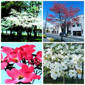 散策に何時も出かける、 水元公園、金町街路樹のハナミズキの花です。 左上のハナミズキは、今はありません。 立派な、枝を張った樹木でしたが、昨年の台風🌀で、無惨な姿に…。 此の側で、絵を描いていらっしゃった方も、残念がっていらっしゃいました。