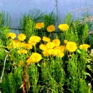 散策の通り道で、小川の向こう岸に、タンポポの花が、固まって咲いていました。