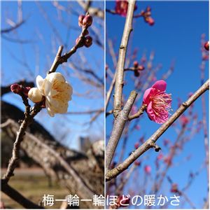 近所の公園の梅🎵。陽当たりが良いせいか咲き始めました。可愛いお花ですね❣️。