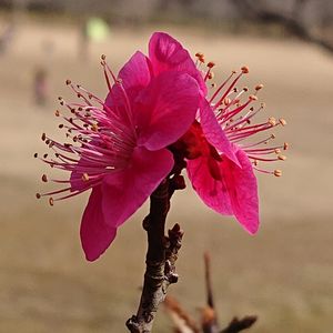 緋桜梅(ヒザクラウメ) 梅は中国原産でヒザクラウメはその栽培品種の1つ。 葉の展開に先だって花を咲かせる。 学名:Prunus mume “Hizakura” Prunusは「plum(スモモ)」 mumeは 「梅」 3月14日