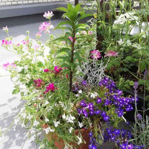 雹で傷んだロベリアをリメイクして菜園に避難していたオリエンタルリリーと寄せ植えに