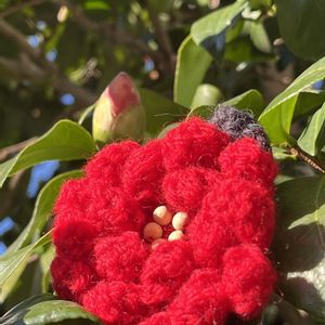 2月10日は🏷ニットの日 毎年出演の椿ちゃんです 肝心の椿がまだあまり咲いていない上に、またもやボロボロの花びら🥲