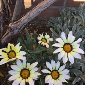 💕✨ガザニア✨💕 おはよう御座います😄。 モッコウバラの足下に植えてある 白のガザニア。 沢山咲きはじめてます。 花びらがバッタさんに食べられてます。 甘くて美味しいのかなぁ〜?