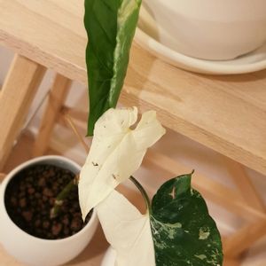 真っ白の葉っぱが徐々に開いてきた♪ 白い葉っぱはやっぱりちょっと小さめ💦 早く穴のあいた葉っぱが欲しいけど 多分これ、デリシオーサ… そこまで大きく育てられるのか…