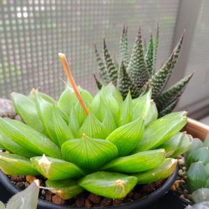 ハオルチア・エメラルダ(?)の花が咲きました。 地味なお花です✨ 子株が沢山付いて来たので株分けしたいと思います。