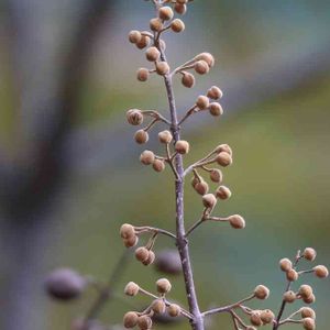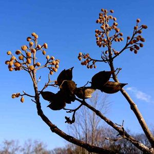 桐(キリ) キリ科キリ属の落葉高木。中国南部原産で、中国では古来より琴の材料として用いられることから、中国文化とともに渡来したのではないかといわれる。材は国産材の中で最も軽く、湿気を通さず狂いがないことから家具材などに使われ一般には栽培もされるが、野生化もしている。葉は五角形状で径20~30㎝前後になり日本最大級。花期は5~6月で、枝の先に円錐形の大形の花序をつけ、淡紫色の花が下向きに開く。10月頃に果実が茶褐色に熟し、木質化して尖った卵形となる。その後先端が2裂して中から数千個といわれる極小の種が飛ばされる。種には縁にフリルのような翼が二重、三重に重なりあい美しい。種を飛ばし終えて枯れた果実は枝に残る。冬の花芽は丸く、毛に覆われ花序にたくさんついて目立ち、一目で桐とわかる。 昔は、女の子が生まれたら桐を植えて嫁入りのときに箪笥をつくる慣習があった。桐は成長が早く、20年前後で利用可能な大きさになる。桐の道管は他の樹木と比べて太く、乾燥させると空洞となってより多くの空気を含む。この蓄えられた空気によって、湿度の変化に敏感に反応し温度の変化を内部に伝えないようにする。湿気の多い日本では、この性質を利用して箪笥を作る。湿度が高いときは湿気を吸収して材が膨らみ隙間が閉まり湿気を通さない。逆に空気が乾燥すると隙間が開いて空気をとおすようになる。また、内部に熱を伝えにくいため燃えにくい。洪水にあっても浮いて流れ、中身を守ってくれる。安政の大地震の後ではその効果が確かめられたので、桐箪笥がよく売れた。 中国では鳳凰の止まる聖木とされる。日本でもこの思想から菊花とならんで皇室の紋章で、菊は正紋、桐は副紋とされる。日本政府も五七桐とよばれる紋章を用いている。 名前の由来は、切ってもすぐ成長するためとも、よく成長させるために一度切るために『切る』がキリになったともいわれる。 出典『都会の木の花図鑑』『樹木の名前』『知っておきたい100の木』