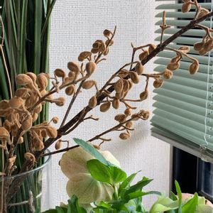 本日3枚目で🙏😊 キリの実です、アーモンドのような形で ビロードのような表面がふわふわです... 今日のお花がキリでやっと日の目を見ました 懐かしい窓辺です 去年の今頃庭には二羽ニワトリが〜〜 ではなく!!😅 クリスマスローズが満開でした2021.4