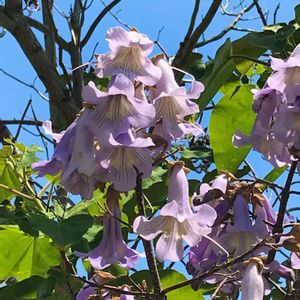 初めて見た桐の花。 中国から日本に入って来て、神聖な木として扱われてきたようです。 薄紫色の大きな花がまとまって咲いてました。