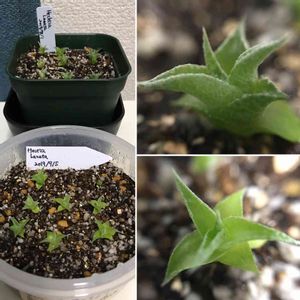 播種から2ヶ月ほどのヘクチア。 プレステラの方は数週間前からラップを外して外で腰水。丸タッパーは未だ密封して室内窓辺。 もともと前者の方が大きかったが外に出してからはタッパー組に追いつかれたように見える。 右上のように、前者は葉の裏側の白い模様が浮かんできた。ただ、環境変化に耐えられなかったのか2つほど色が白けてきてる。 右下はタッパー組。