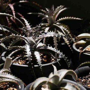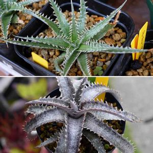 ディッキアを育て始めて1年が過ぎましたが、全く何も学ばず😖ちょっと動きがあるとそれに一喜一憂しております😖 この3株はみんなdyckia dawsoniiの名が付いていて、いわゆるフォーム違いや選抜種です。 1番上が原種ダウソニー、真ん中が棘がピンクに染まるタイプ、1番下がガーネットクロウという選抜種。 全て開花サイズまで育つと各々素晴らしい見栄えの株になるはず(^.^ とりあえず、優しく放っておくので、特長が出るくらいまでは育って欲しいです。
