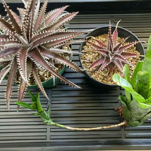 前回ディッキアのプレゼント企画をする旨の投稿をしましたが、その準備を始めました。 もしかしたら小さめのディッキアも需要があるかなぁと思い、3号鉢以下のサイズも用意出来たらと思います。 ただ子株だと育てるのにハードルが高いかもしれないので、今回は小さく作れたディッキアの成株をいくつか。 この写真の株は実は兄弟株です。 両方とも親から外し2年半ほどで、しっかりと特長を出し育ちました😋 ディッキアは鉢のサイズを緩めなければそれなりに育ちますが、根鉢になりすぎると徒長しやすくなったり葉先を枯らしたりと弊害が出ます。 しかしこの左のミニサイズは問題無く小さく育ちました。 こんな株を幾つか用意出来たらと思います。