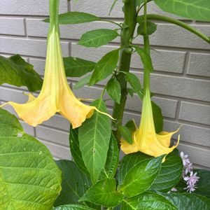 おはようございます😊 ⚠️最後に🐛ちゃんでます m(*_ _)m ①エンゼルストランペット🎺 咲いてました😳 去年より開花が2週間くらい早いです😅 丈は余り伸びてないのに! 暑かったからかなぁ( ˊᵕˋ ;)💦- ̗̀🐯 ̖́- ②アメリカンブルー💙 ✂️後花数増えたー🎶 ③④黒法師♥ 片方葉焼けさせちゃいました🍂🔥🥲 さて?復活なるか?👀✨ 🏷️棒の日参加?笑⃝ ⑤実生のゆずの木🌲に居た ゆず坊…🐛🫢 ゆずの木は小さいので大きく育ってるレモン🍋の木にピンセットで摘んで移動させました🤭 あの…オレンジ色の肉角だしてましたよ…( •́ฅ•̀ )クサッ