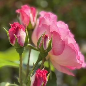 今日は我が家のピンクの薔薇をご紹介🌹 ①②ER『ユーステイシア ヴァイ 』 アプリコットピンクのロゼット咲きの可愛らしい薔薇💖 フルーティなめちゃくちゃ良い香りがします✨ とても良く香るので、花もちは我が家で一、二を争う悪さ😅 一日で褪色し、キレイな花弁のままハラリと散ってしまいます 満開になる前に先の花が散ってしまうので、株一面に咲かすのは至難の業 鉢を動かしただけで、ハラハラと散ってしまうことも・・・ 株いっぱいに咲かす方法、教えて欲しい😂 でも、本当に花はとっても可愛い💖(フォローになっていない💦) ③④ER『サイラスマーナー 』 ソフトピンクのカップ咲きから咲き進むとボタンアイに変化する、これまた可愛らしい薔薇💖 今年は上を向いて、今まで一番大きく美しく咲き始めましたが、徐々にシュラブらしく自由に伸びて咲いています 雨が続き、満開の撮影機会を逸してしまいました💦 晴れてまたすぐ雨が降って、また晴れても雨で曇って・・・ 晴れが3日間でも続いてくれたら、薔薇も綺麗に咲いてくれるのになぁ なんて、モヤモヤしちゃう毎日🌹 ただただ薔薇を楽しめば良いのに、最近はお天気にナーバスになっています😞 ⑤デルバール 『コンテス ドゥ セギュール 』 シンプルなピンクの薔薇ですが、小ぶりで品があります💖 去年は蕾の時期に水切れを起こし、一番花を逃してしまったので、今年は水切れに注意しました 去年の失敗を活かし、無事開花しました🥰