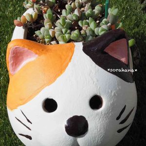猫型素焼き鉢にペイントして、三毛猫鉢に(ΦωΦ) 植えるのはやっぱり碧魚連🐟