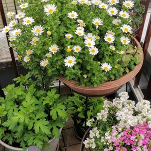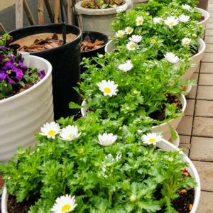 おはようございます(*´∇`*)ノ 今朝は☔… お花さん達には気持ち良いシャワーかなぁ〜😁 2株づつのマーガレットさんの2つのプランター、間にはノースポールちょっと背が足りないけどモリモリ🌼🌼🌼😄