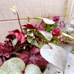 ビオラの寄せ植え🧺 ですが 白いシクラメンを主役に横から🤍🤍 シルバーリーフというのでお迎えしました🌿 見元ビオラは『春らら』チラッ❤ 葉牡丹、アリッサム、クローバーなど…