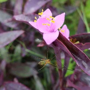 ムラサキゴテンのそばに、カラフルな蜘蛛が・・・