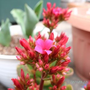 黄緑のカランコエが沢山ある中で、ひとつだけ赤いカランコエが売ってました。 色が濃い赤で情熱的で思わず買ってしまいました。 沢山咲いたらもっと素敵になりそうです。